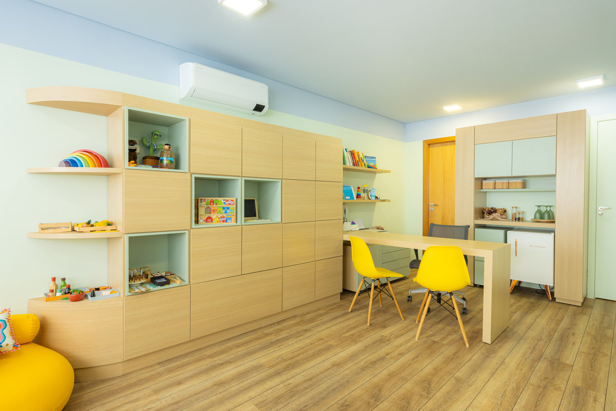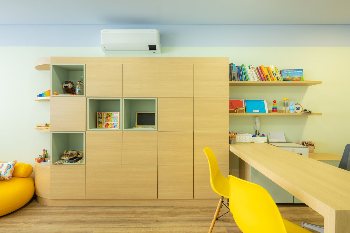 Os armários em madeira entram como elemento de estabilidade, aquecendo o ambiente e trazendo um toque natural que equilibra a composição cromática. A escolha por mobiliário funcional, de linhas simples e acabamento suave, reflete o cuidado com a rotina dos profissionais e a liberdade de movimento dos pequenos pacientes.