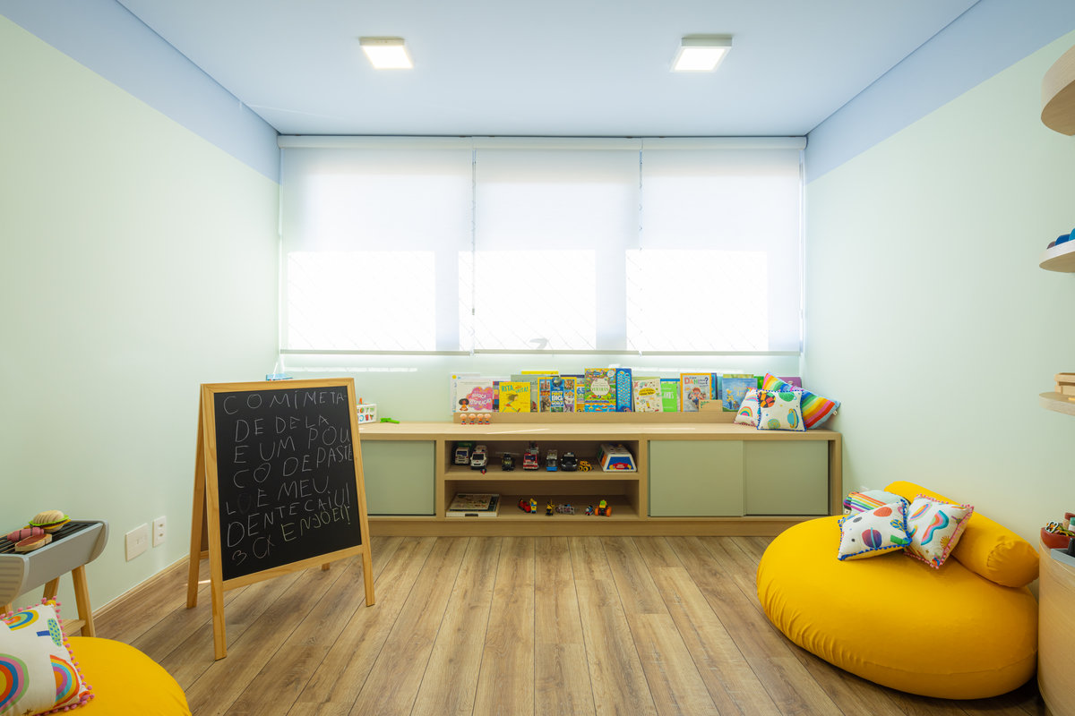 Optamos por uma paleta de cores suaves e reconfortantes, com tons de amarelo, verde e azul em nuances claras que evocam calma, alegria e equilíbrio emocional. Esses tons, aplicados com delicadeza, favorecem o bem-estar e estimulam uma vivência mais leve desde o primeiro contato com o espaço.