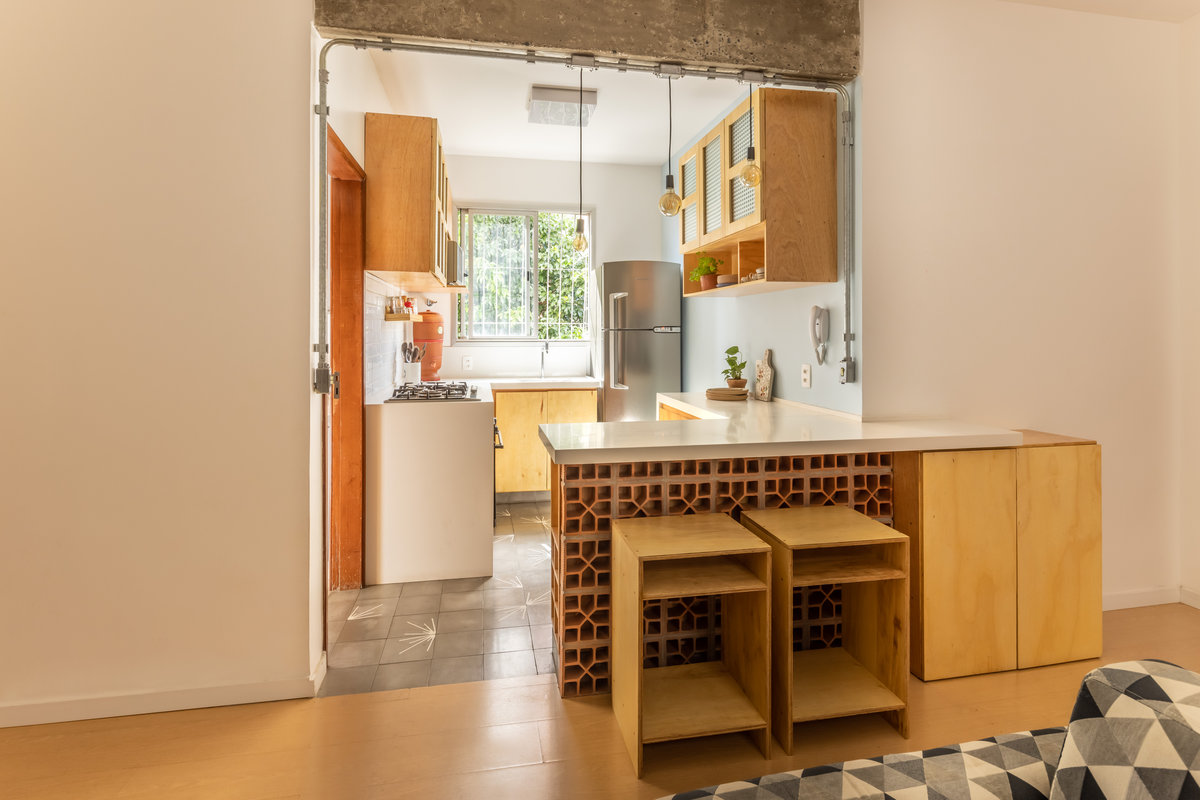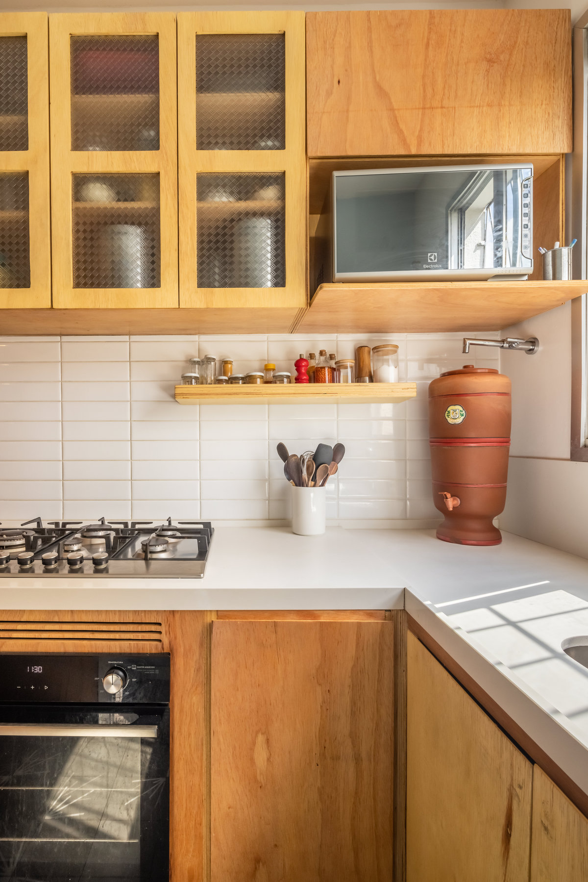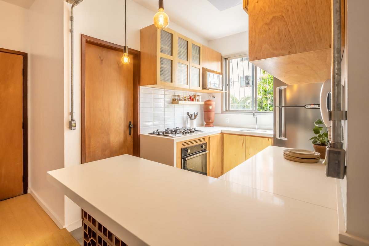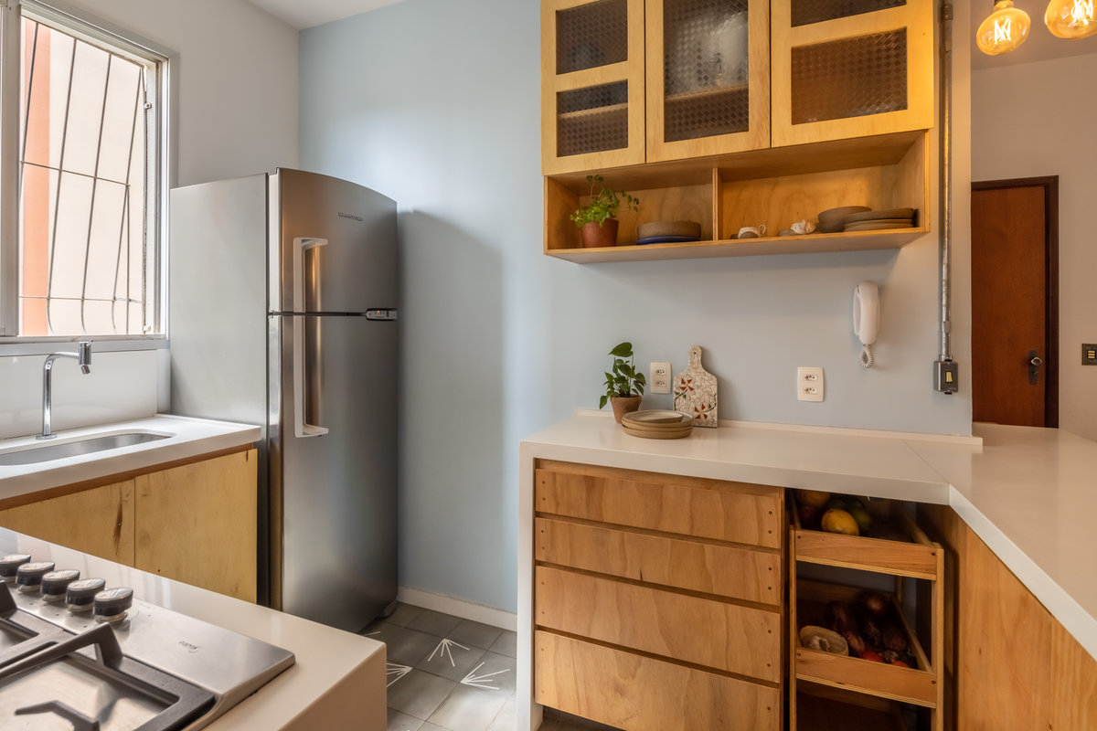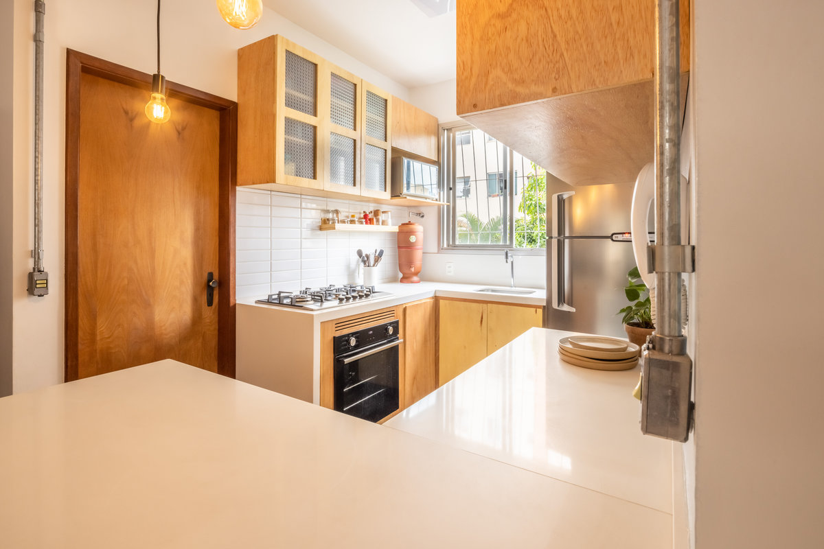 Os armários, executados em compensado naval, trazem à tona a beleza natural da madeira, com suas texturas sutis e tonalidades quentes que conferem organicidade ao espaço. A opção pelo compensado não é apenas estética, mas também funcional: trata-se de um material resistente à umidade, durável e versátil — perfeito para o coração da casa.
